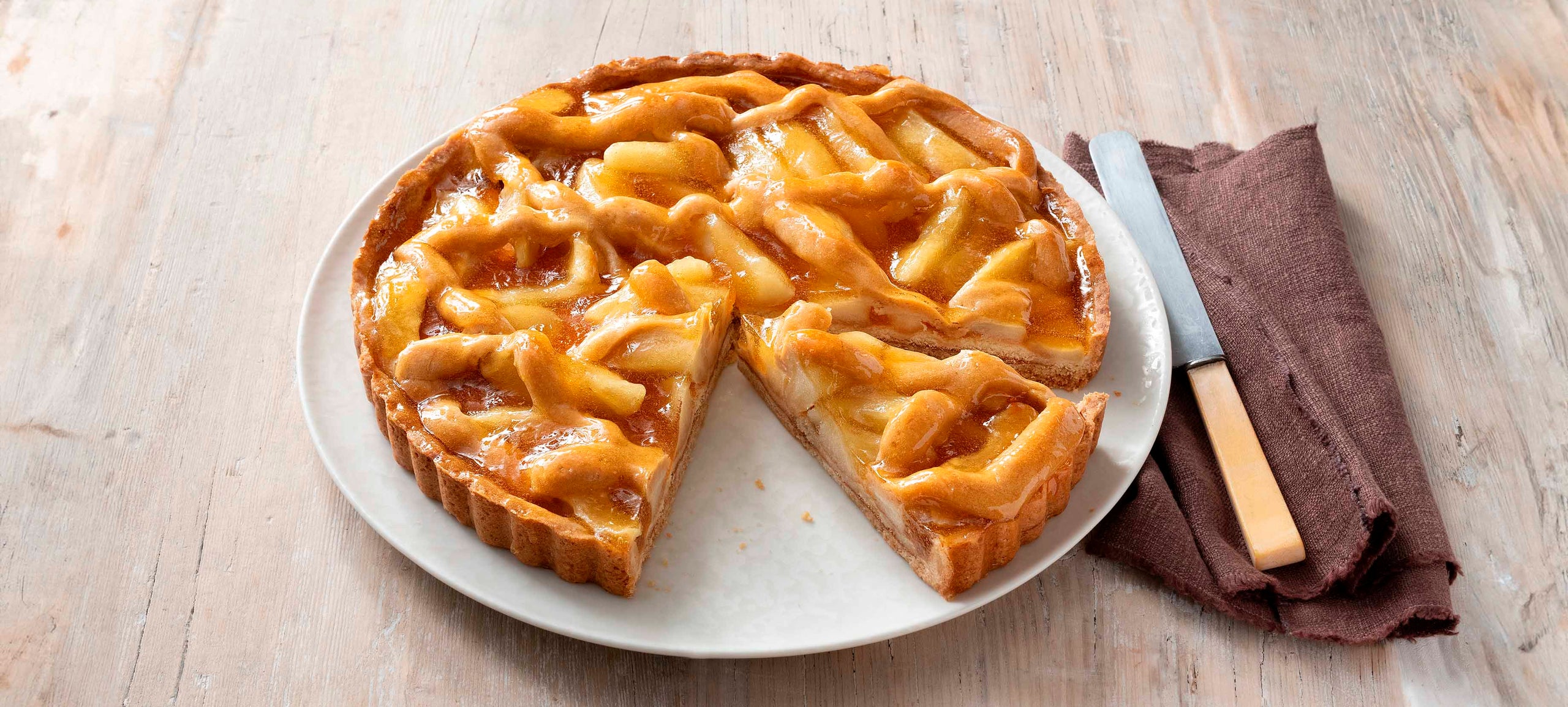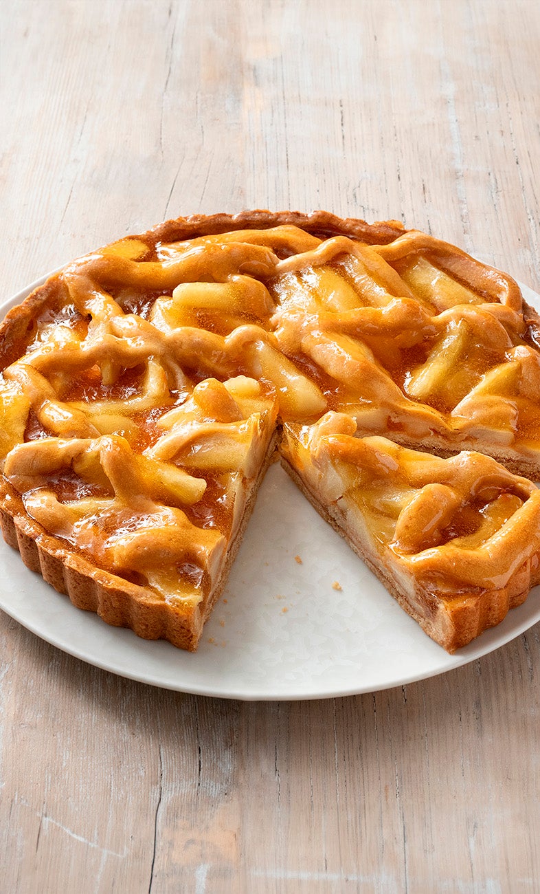 Torta di mele con fragrante pasta frolla al burro,soffice Pan di Spagna e spicchi di mele.