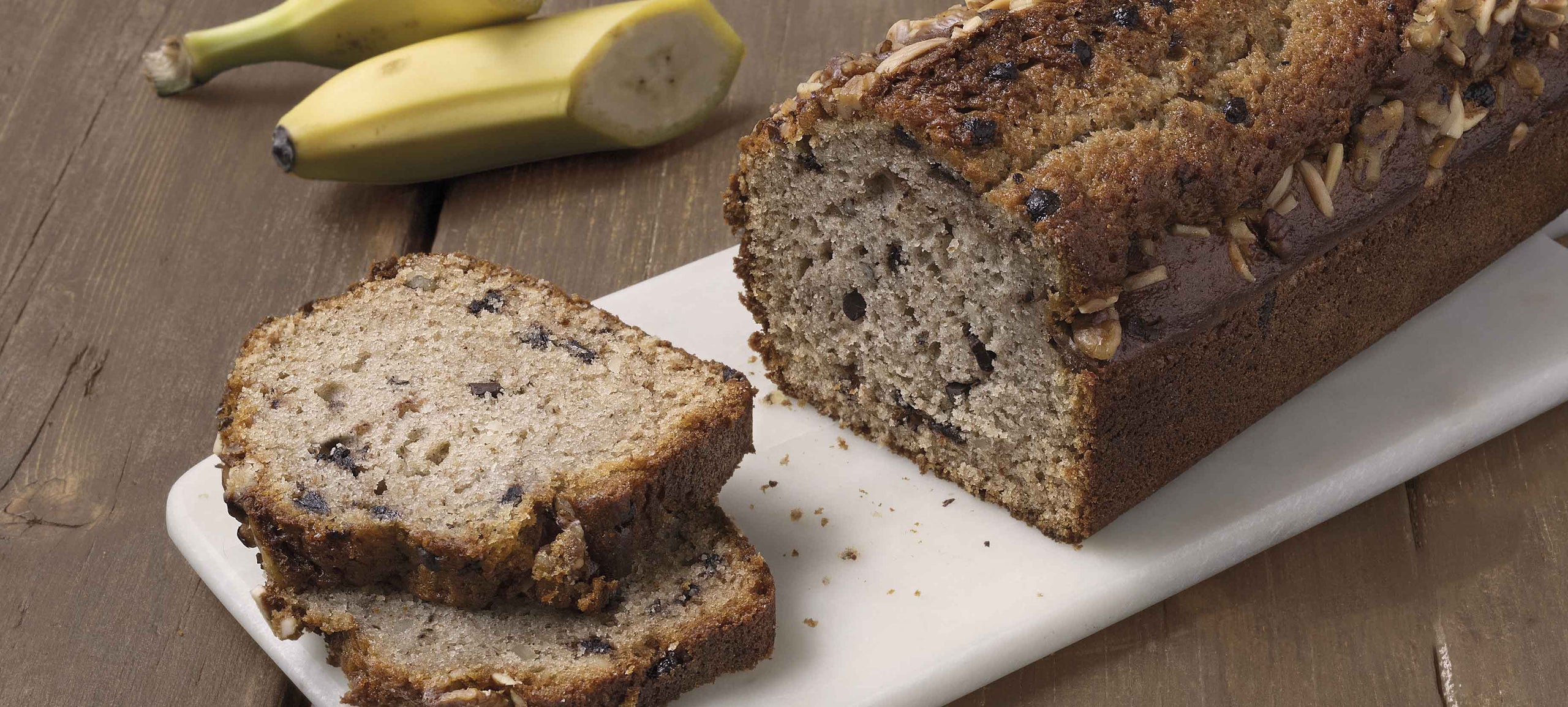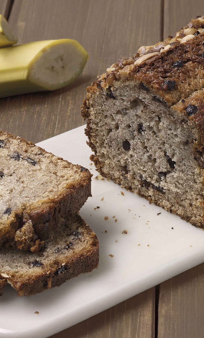 A forma di plumcake, impasto con purea di banana, uova, noci, mandorle e gocce di cioccolato.