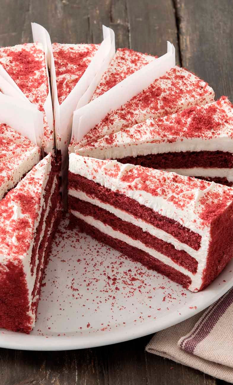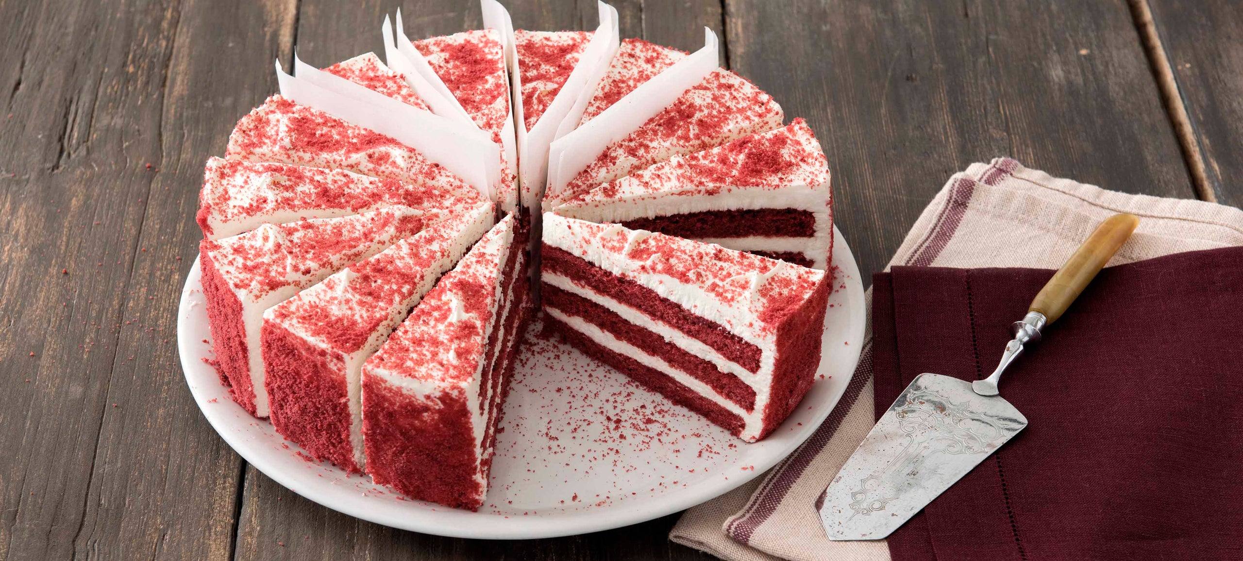 Tipico dolce americano con pan di Spagna rosso farcito con crema al formaggio e decorato con granella di pan di Spagna. Torta pretagliata.